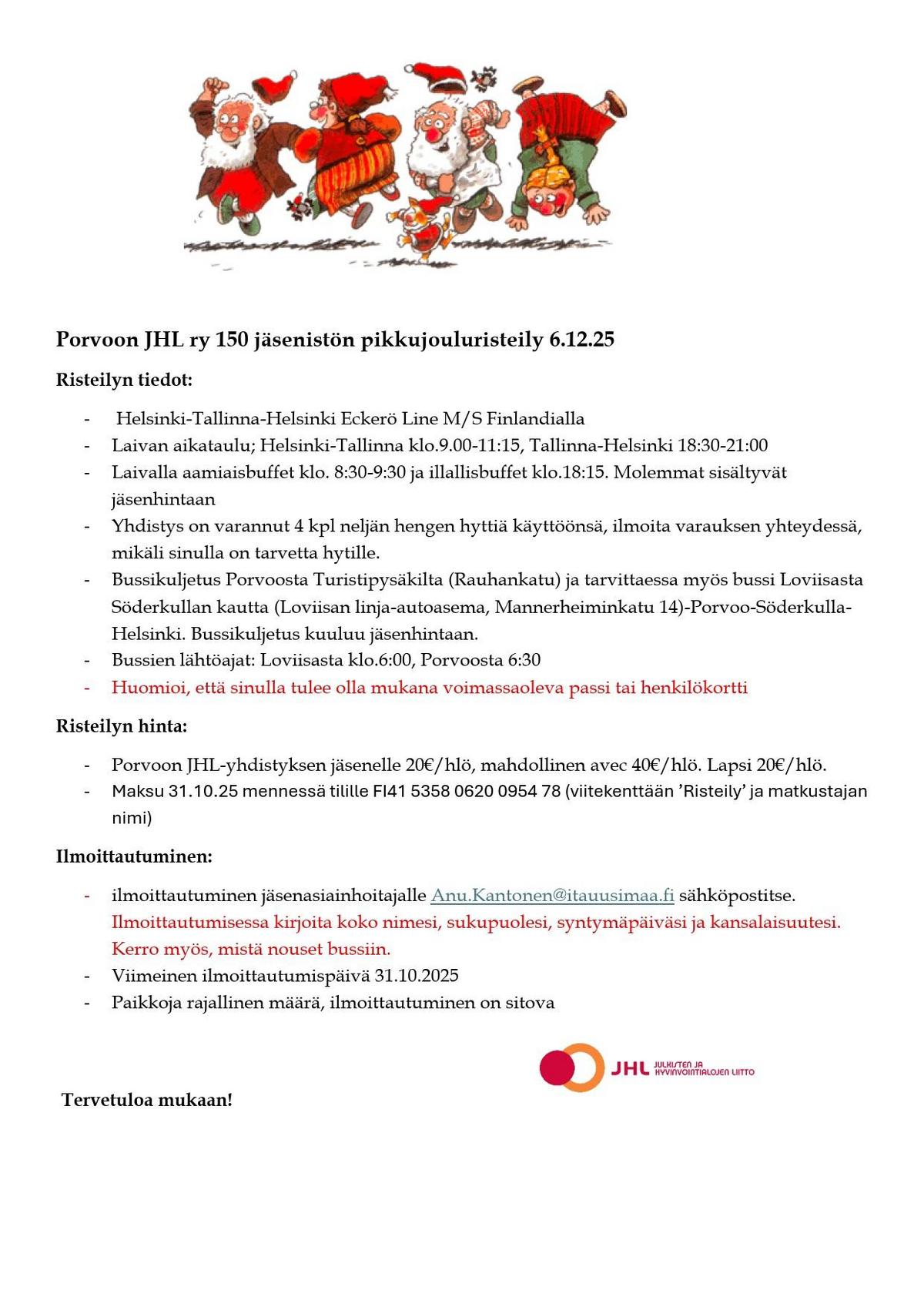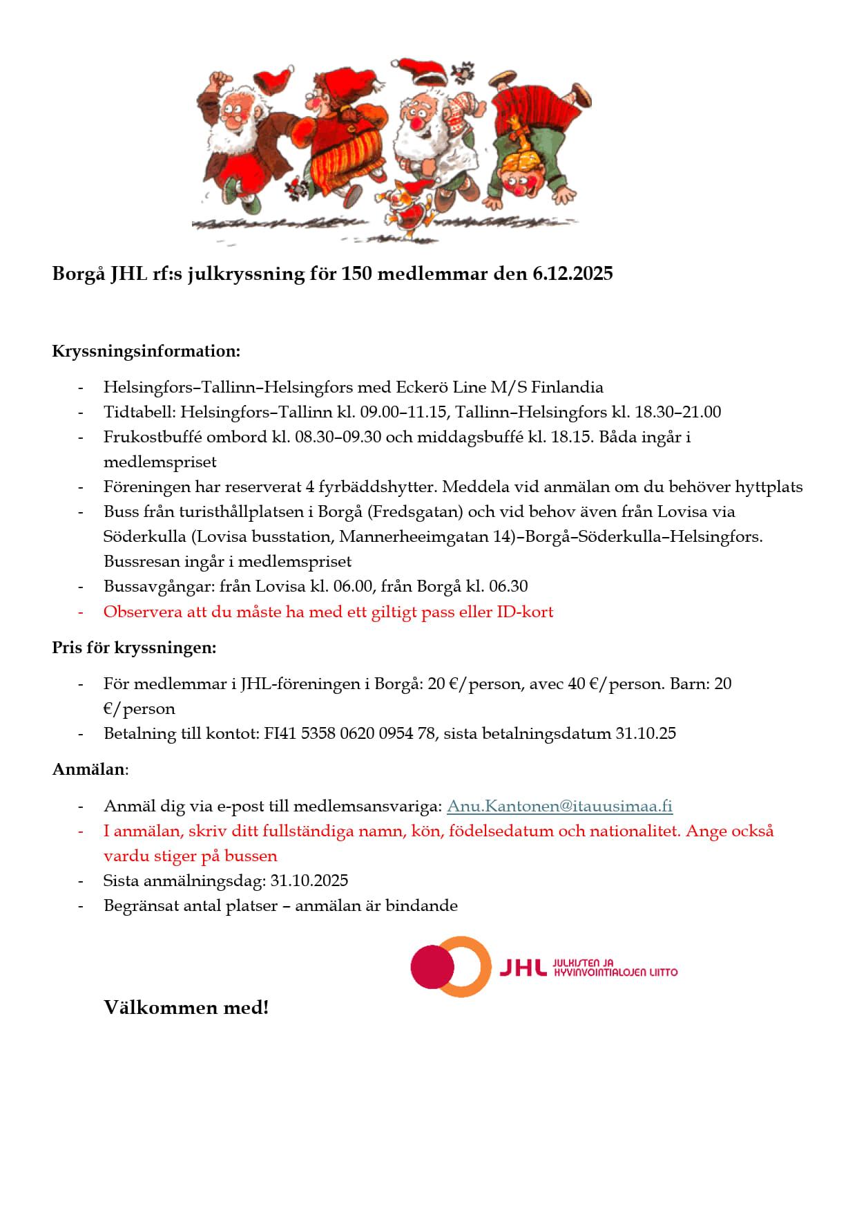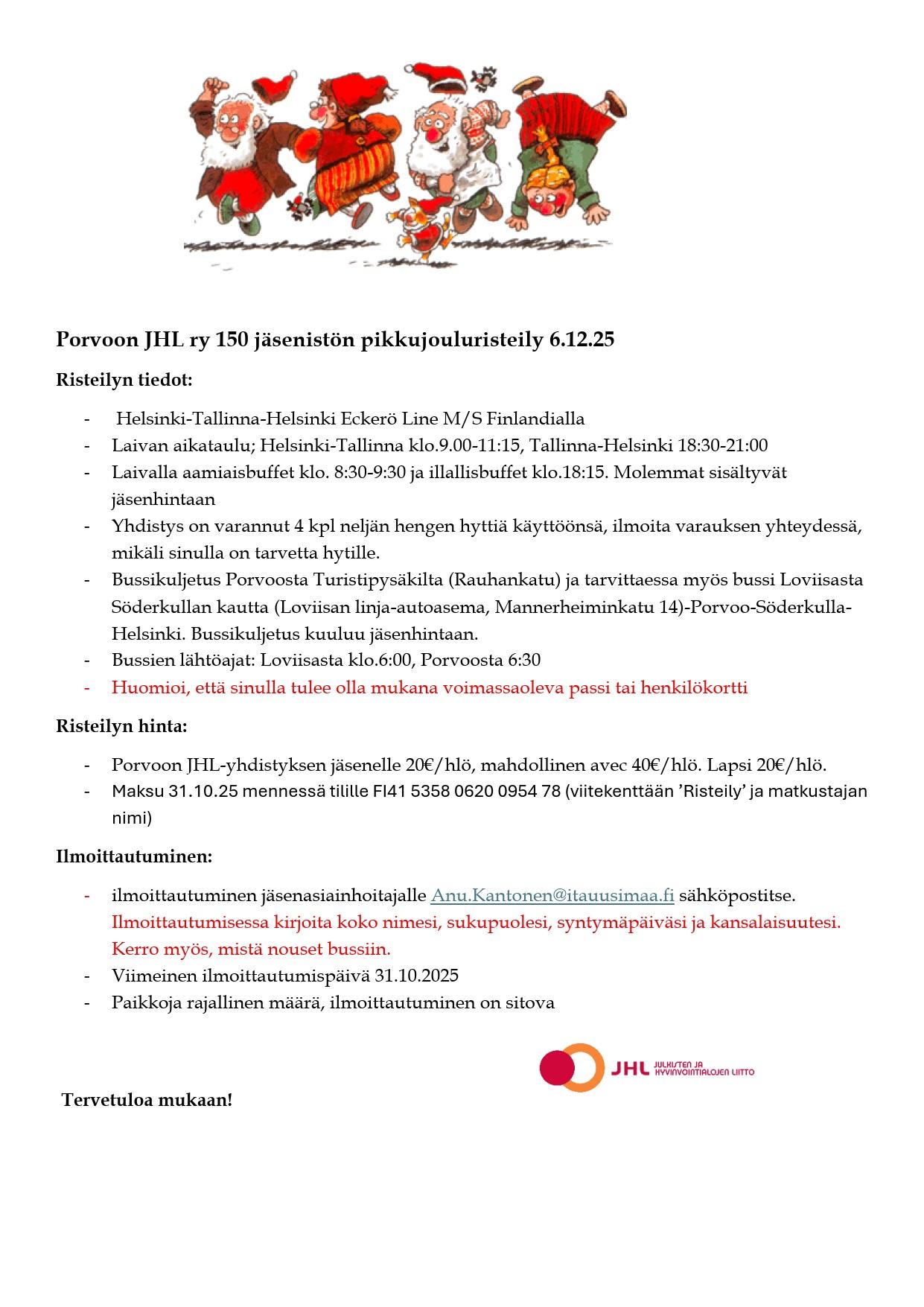Porvoon JHL ry 150 jäsenistön pikkujouluristeily 6.12.25 / Borgå JHL rf:s julkryssning för 150 medlemmar den 6.12.2025